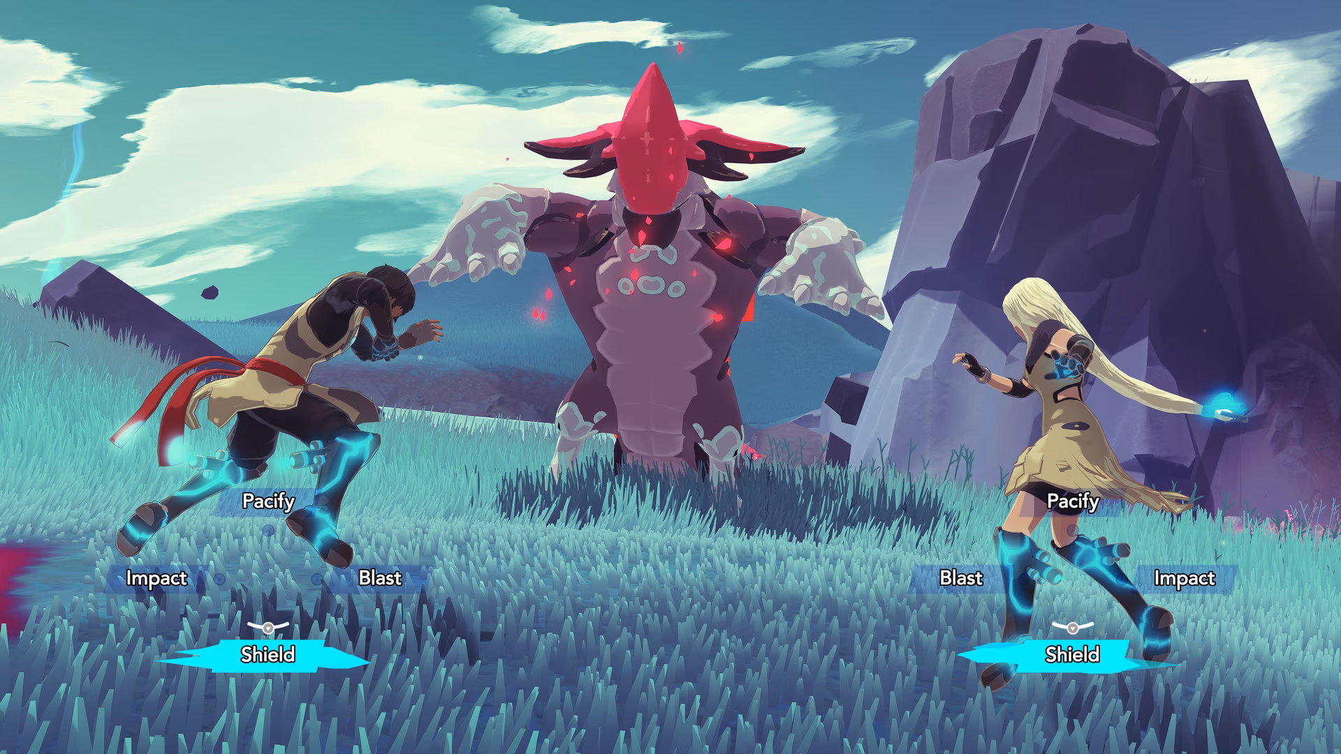 I was initially afraid that combat would be tedious or detract from the cozy vibe, especially since the first few hours focus solely on the gliding and exploration. Turns out, it wasn’t that way, and it complemented the game perfectly. The fighting is best described as a rock-paper-scissors-like system; some enemies are weak to Blast, some to Impact, and often you need to time a guard or stun them with one character before following up with a quick pre-charged attack from the other. You command both characters, using the D-pad for Kay and the face buttons for Yu, with just five commands in total for each.