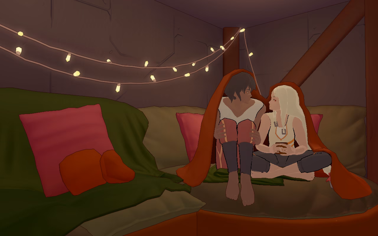 This immersive atmosphere is built upon the perfect chemistry between the two leads. Yu and Kay talk and interact like a real couple. They sound like a real couple. Not every conversation has to be plot-heavy; some are just happy, playful banter, some involve just looking at the sky gazing at the stars, and some are just glazing at how delicious the food is. It truly feels genuine, achieving a slice-of-life quality, but set in their unique sci-fi exile, not our regular world. That genuine feel is very rarely seen in games involving romantic couples. The game’s narrative is very immersive, focusing on the realistic chemistry of the couple through mundane yet intimate dialogue, a feat only made possible by the high-quality, convincing performances from both voice actors.