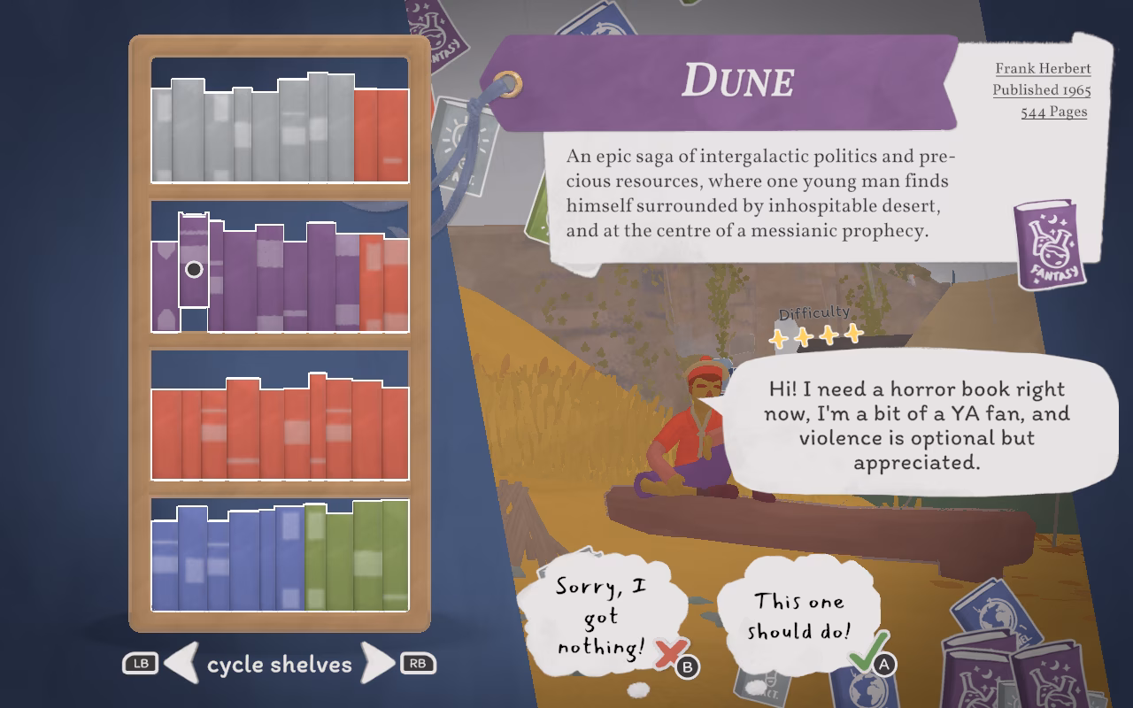 What makes the experience pop (aside from the cozy, lo-fi visuals) is seeing all these references to real-life books from all over, because the game contains mostly real-life books for you to buy and sell about, and that actual readers, or even non-readers like me would instantly recognize. I have never read a full book, especially story ones, but I do know my own share of literatures, probably due to the fact that most of them gets adapted anyways to other forms of media. Books such as Dune, The Lord of the Rings, or even Manga like Attack on Titan.