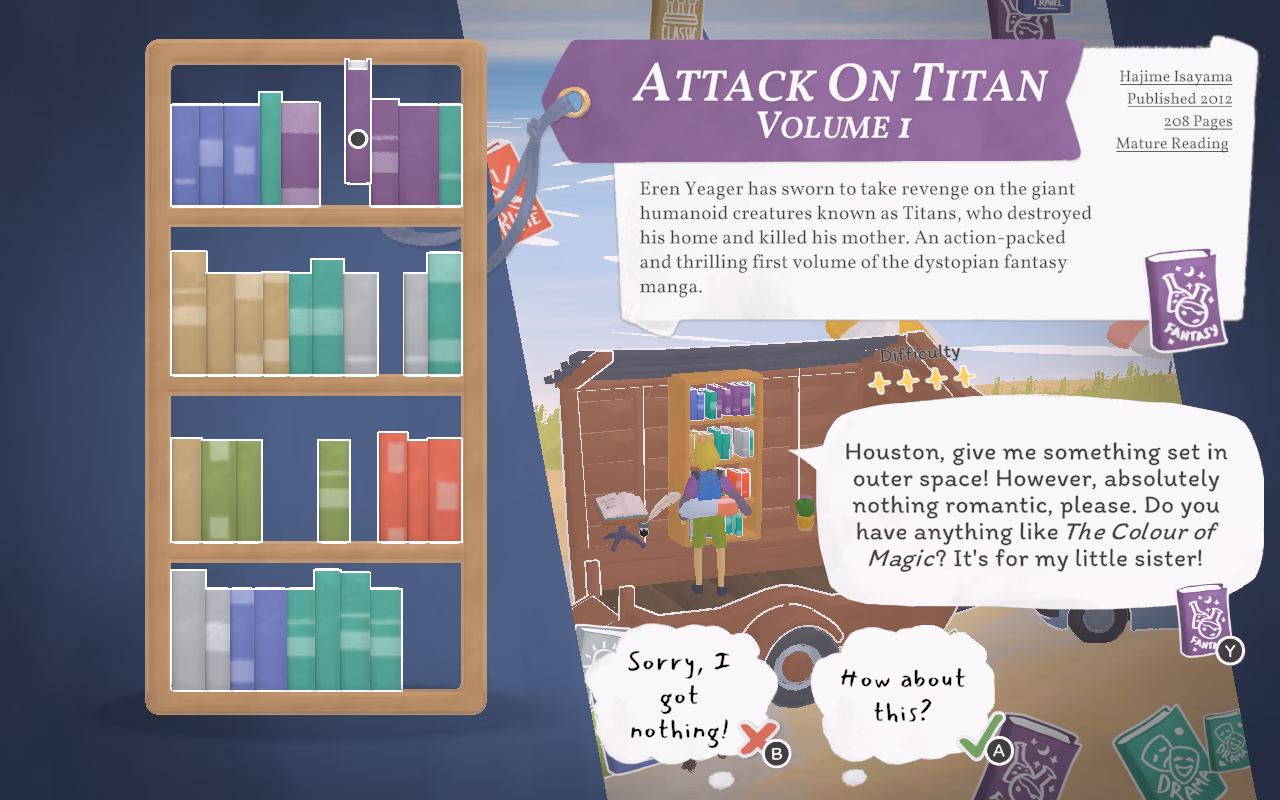 What makes the experience pop (aside from the cozy, lo-fi visuals) is seeing all these references to real-life books from all over, because the game contains mostly real-life books for you to buy and sell about, and that actual readers, or even non-readers like me would instantly recognize. I have never read a full book, especially story ones, but I do know my own share of literatures, probably due to the fact that most of them gets adapted anyways to other forms of media. Books such as Dune, The Lord of the Rings, or even Manga like Attack on Titan.